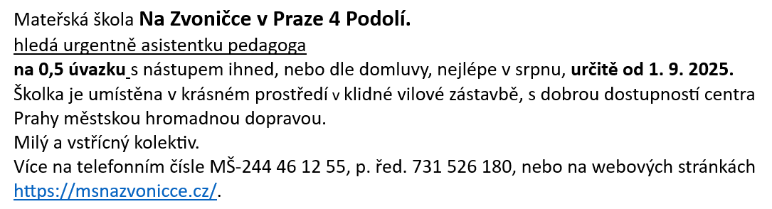 Telefon do MŠ Na Zvoničce: 244 461 255 Telefon do 5.třídy na Nedvědově náměstí: 725 769 056