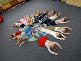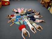 - Vlčata stříhají proužky barevného papíru na lidské tělo