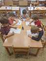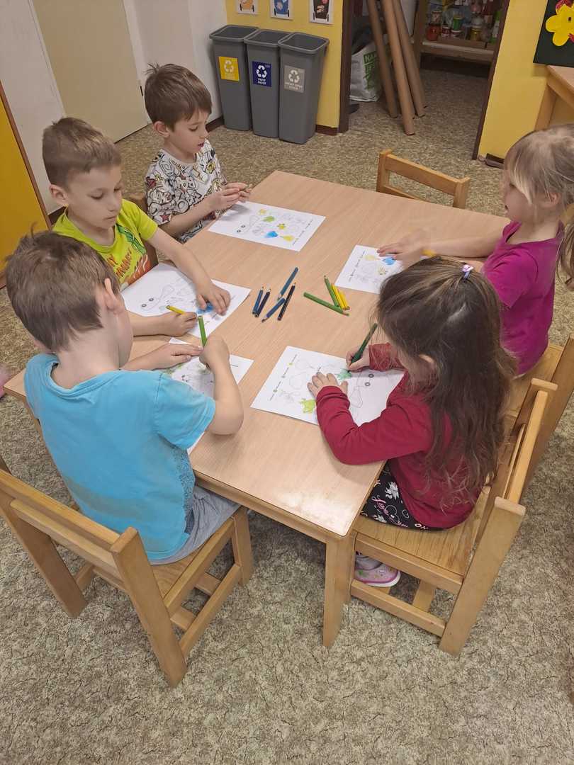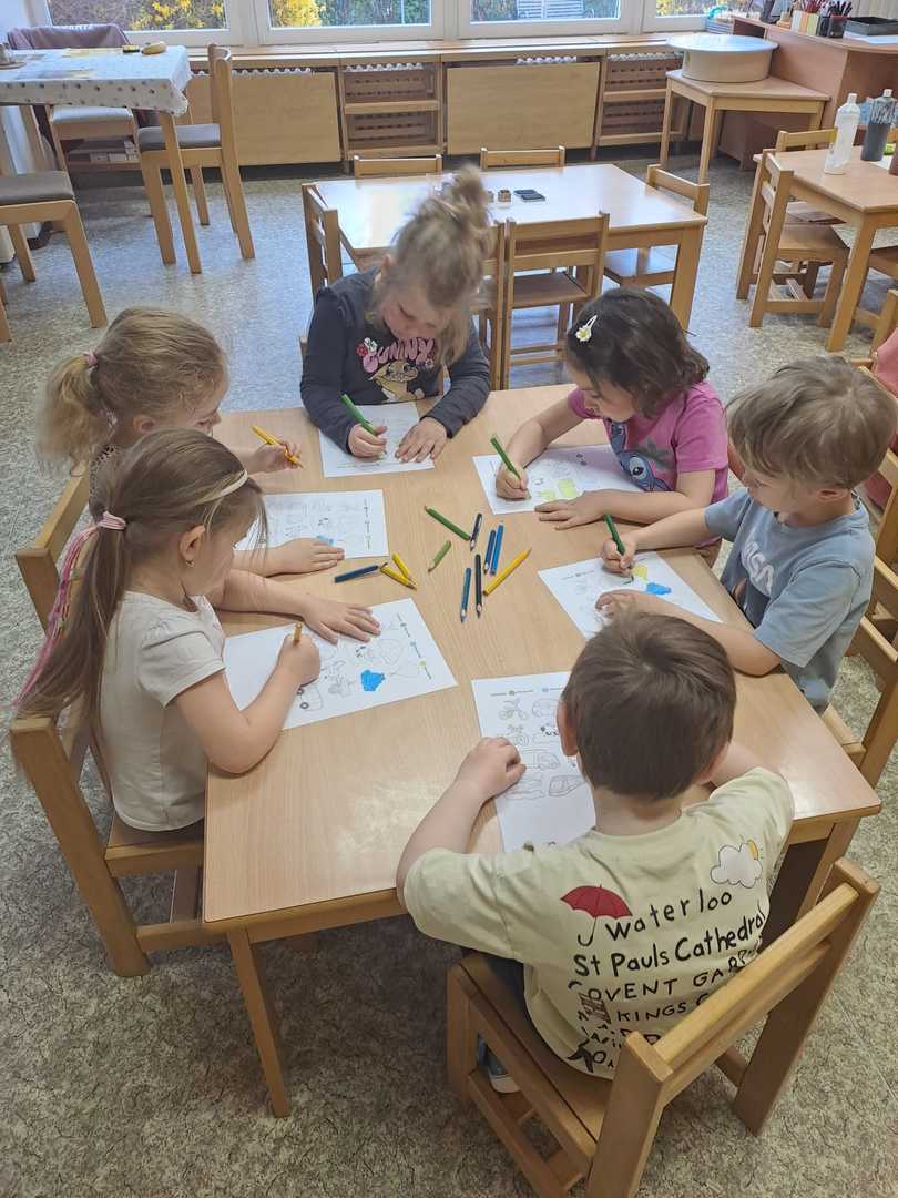 - Vlčata stříhají proužky barevného papíru na lidské tělo