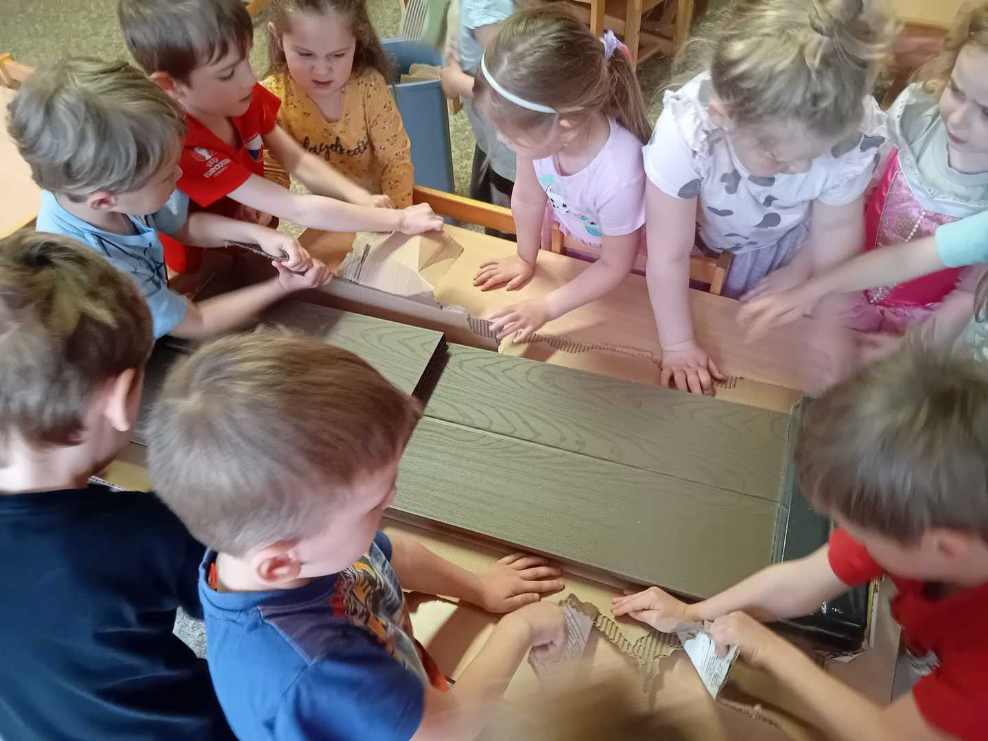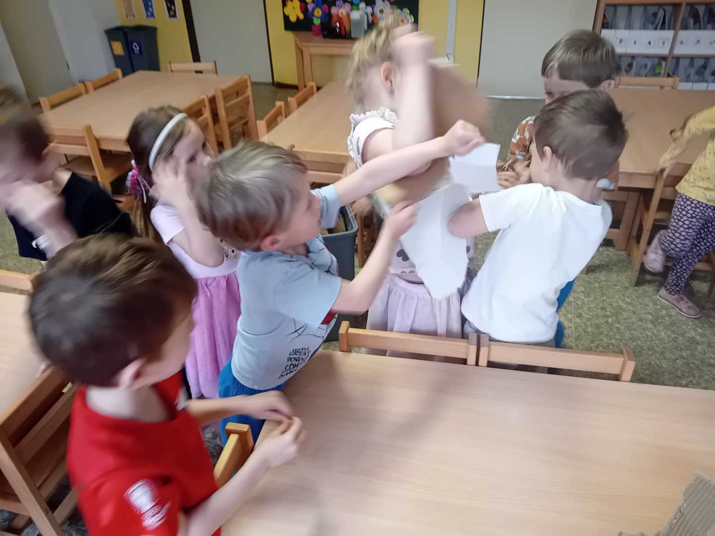 - Vlčata stříhají proužky barevného papíru na lidské tělo