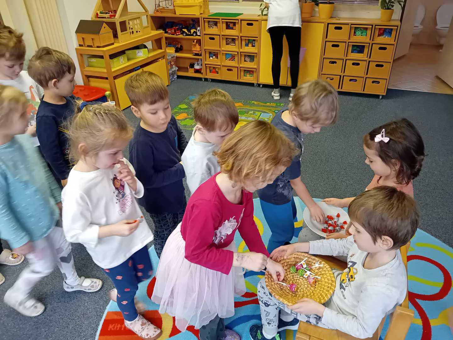 - Vlčata stříhají proužky barevného papíru na lidské tělo