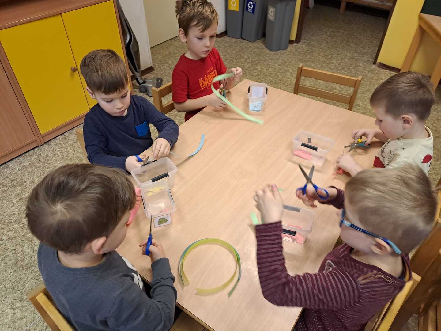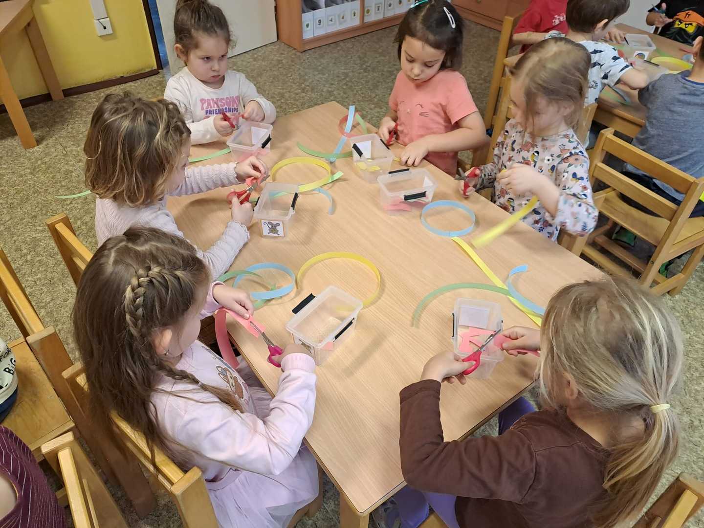 - Vlčata stříhají proužky barevného papíru na lidské tělo